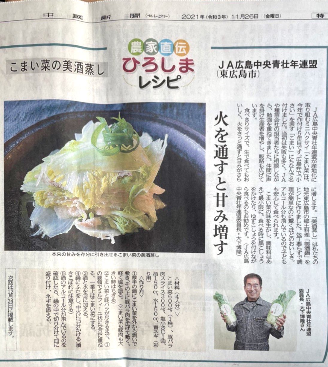 中国新聞セレクト掲載(2021年11月26日) 2023 4/12 未分類 2021年11月25日2023年4月12日 2021年11月26日の中国新聞セレクト紙面の 「農家直伝ひろしまレシピ」コーナー に、農青連の盟友で作付けしているこまい菜を使った 「こまい菜の美酒蒸し」レシピが掲載されました。 酒都 西条の郷土料理「美酒鍋」にちなんだネーミングです。 未分類 よかったらシェアしてね! URLをコピーしました! URLをコピーしました! つなぐ大地の絆 RCCテレビ イマナマ!「今夜の晩餐~広島の食材で最高の鍋料理」2021年12月17日 この記事を書いた人 大下 博隆 関連記事 農業視察に行ってきました! 2023年12月1日 選挙ポスター 2023年4月16日 令和5年 東広島市議会議員一般選挙 2023年4月16日 令和4年 東広島市議会議員補欠選挙 2023年4月16日 市議会情報(東広島市民ポータルサイト) 2023年4月13日 市議会活動報告(令和5年3月) 2023年4月12日 令和4年第4回定例会 一般質問 2023年4月12日 令和4年第2回定例会 一般質問 2023年4月12日 コメント コメントする コメントをキャンセルコメント ※ 名前 ※ メール ※ サイト 次回のコメントで使用するためブラウザーに自分の名前、メールアドレス、サイトを保存する。
