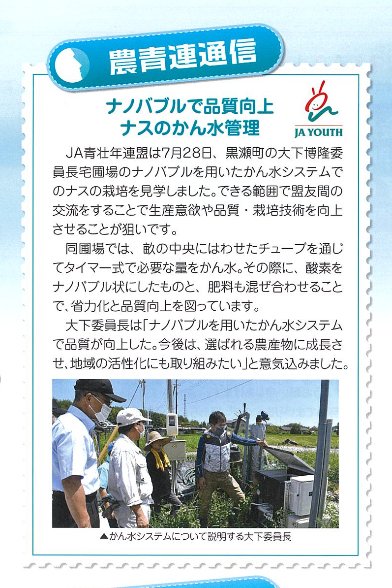 新技術導入 2023 4/12 未分類 2021年11月9日2023年4月12日 酸素ボンベからの酸素を特殊な装置で消えない泡(ナノバブル)化 することにより植物の根に直接酸素と水を供給するシステムを 用いることによる省力化、品質向上の勉強会を行いました。 未分類 よかったらシェアしてね! URLをコピーしました! URLをコピーしました! 子ども110番の家 葉牡丹生産 この記事を書いた人 大下 博隆 関連記事 農業視察に行ってきました! 2023年12月1日 選挙ポスター 2023年4月16日 令和5年 東広島市議会議員一般選挙 2023年4月16日 令和4年 東広島市議会議員補欠選挙 2023年4月16日 市議会情報(東広島市民ポータルサイト) 2023年4月13日 市議会活動報告(令和5年3月) 2023年4月12日 令和4年第4回定例会 一般質問 2023年4月12日 令和4年第2回定例会 一般質問 2023年4月12日 コメント コメントする コメントをキャンセルコメント ※ 名前 ※ メール ※ サイト 次回のコメントで使用するためブラウザーに自分の名前、メールアドレス、サイトを保存する。